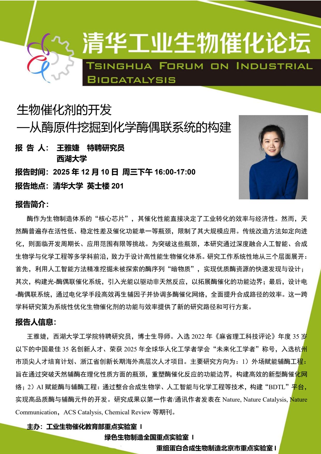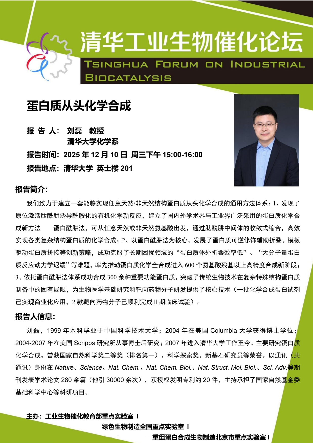 本期邀请了刘磊教授和王雅婕特聘研究员做客“清华工业生物催化论坛”,欢迎各位师生参加交流! 报告题目1:蛋白质从头化学合成 报 告 人1: 刘磊 教授 ,清华大学化学系 报告题目2:生物催化剂的开发—从酶原件挖掘到化学酶偶联系统的构建 报 告 人2:王雅婕 特聘研究员 ,西湖大学 报告时间:2025年12月10日 周三下午15:00-17:00 报告地点:英士楼201
