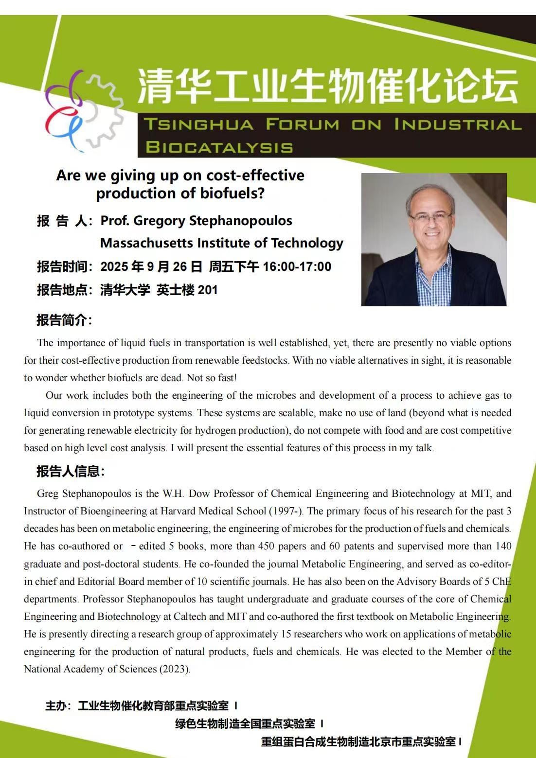 本期邀请了Gregory Stephanopoulos教授做客“清华工业生物催化论坛”,欢迎各位师生参加交流! 报告题目:Are we giving up on cost-effective production of biofuels? 报 告 人: Gregory Stephanopoulos ,Massachusetts Institute of Technology 报告时间:2025年9月26日 周五下午16:00-17:00 报告地点:英士楼201
